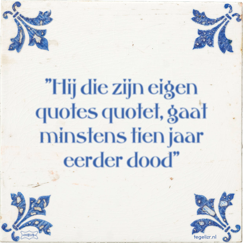 "Hij die zijn eigen quotes quotet, gaat minstens tien jaar eerder dood" 10 keer bekeken Hoeveel sterren is dit tegeltje waard? 54321 geef sterren Leuk? Of kun jij het beter? Maak je eigen tegeltje. Jouw tekst: Alleen letters, cijfers en leestekens. Maximale lengte 90 tekens bak mijn tegeltje Recente tegeltjes 1 tot 12 "Hij die zijn eigen quotes quotet, gaat minstens tien jaar eerder dood" -Ferran 2026Feesten zonder alcohol is als lopen zonder loopschoenen: het is verdomme makkelijker mét!De beste PDF is geen PDFJe kan ook lopen zonder loopschoenen, maar het is verdomme makkelijker metAlles met genietjes aan elkaar nieten"Een bestuur dat luistert naar zijn wortels, groeit tot in de hemel."Je wilt hier niet alles willen begrijpenVerlies nooit uit het oog voor wie de tafel eigenlijk gedekt is.Wie de regels van het spel kent, durft de grenzen van het veld te benutten.Ervaring uit een andere stal geeft vaak de beste mest voor eigen groeiOnze variatie is onze kracht, onze zelfde missie onze macht.Ik maak de tafel diverser qua achtergrondvolgende 12 tegels›Bovenkant Bak een tegeltje! Bak een tegeltje! Jouw tekst: Alleen letters, cijfers en leestekens. Maximale lengte 90 tekens bak mijn tegeltje ×