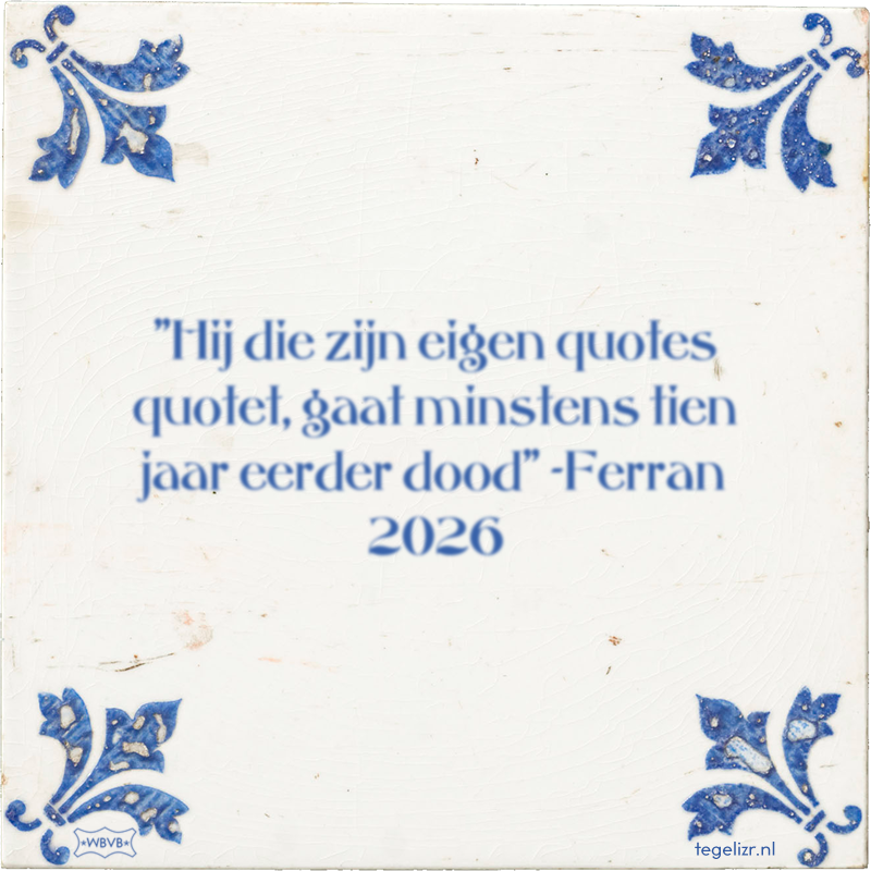 "Hij die zijn eigen quotes quotet, gaat minstens tien jaar eerder dood" -Ferran 2026 9 keer bekeken Hoeveel sterren is dit tegeltje waard? 54321 geef sterren Leuk? Of kun jij het beter? Maak je eigen tegeltje. Jouw tekst: Alleen letters, cijfers en leestekens. Maximale lengte 90 tekens bak mijn tegeltje Recente tegeltjes 1 tot 12 "Hij die zijn eigen quotes quotet, gaat minstens tien jaar eerder dood"Feesten zonder alcohol is als lopen zonder loopschoenen: het is verdomme makkelijker mét!De beste PDF is geen PDFJe kan ook lopen zonder loopschoenen, maar het is verdomme makkelijker metAlles met genietjes aan elkaar nieten"Een bestuur dat luistert naar zijn wortels, groeit tot in de hemel."Je wilt hier niet alles willen begrijpenVerlies nooit uit het oog voor wie de tafel eigenlijk gedekt is.Wie de regels van het spel kent, durft de grenzen van het veld te benutten.Ervaring uit een andere stal geeft vaak de beste mest voor eigen groeiOnze variatie is onze kracht, onze zelfde missie onze macht.Ik maak de tafel diverser qua achtergrondvolgende 12 tegels›Bovenkant Bak een tegeltje! Bak een tegeltje! Jouw tekst: Alleen letters, cijfers en leestekens. Maximale lengte 90 tekens bak mijn tegeltje ×
