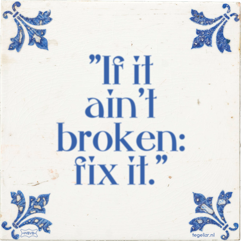 "If it ain't broken: fix it." 13 keer bekeken Hoeveel sterren is dit tegeltje waard? 54321 geef sterren Leuk? Of kun jij het beter? Maak je eigen tegeltje. Jouw tekst: Alleen letters, cijfers en leestekens. Maximale lengte 90 tekens bak mijn tegeltje Recente tegeltjes 1 tot 12 In de Kabouter Plop is een deurmat meer waard dan een vrouwIf it ain't broke, fix it.Ik zei nog zo, géén bommetje!Onze ervaringen zijn nooit gelijk, maar ze rijmen welJe fantasie is niet wat het lijktJe hebt geen probleem, maar een uitdaging!Hier staat een diepe wijsheidGoeiemoarn myn leafsteTijdzones zijn overratedNiet afleiden. Dat is heus niet leukWat hebben we geleerd vandaagvoorspellen is moeilijk, vooral als het de toekomst betreftvolgende 12 tegels›Bovenkant Bak een tegeltje! Bak een tegeltje! Jouw tekst: Alleen letters, cijfers en leestekens. Maximale lengte 90 tekens bak mijn tegeltje ×